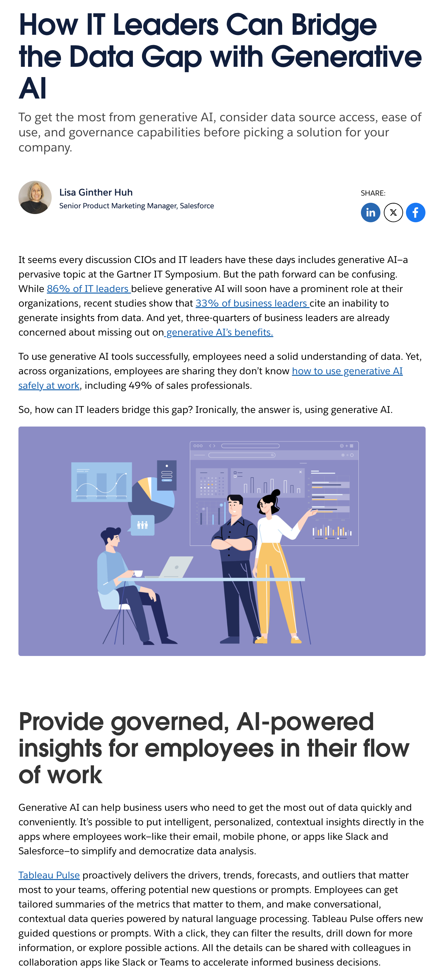 I ghostwrote this thought leadership blog about generative AI with Tableau stakeholders—a fun and collaborative process. They gave me a 6-sentence outline to start, and we fleshed out the draft together iteratively. The post was meant to drive brand awareness.